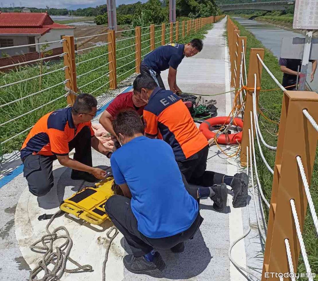 ▲台南六甲嘉南大圳3號橋傳出有女子落水,台南市消防局據報,出動六甲分隊消防人員前往救援,消防人員救起1名年約30多歲女子,緊急送醫急救。(圖/民眾提供,下同)