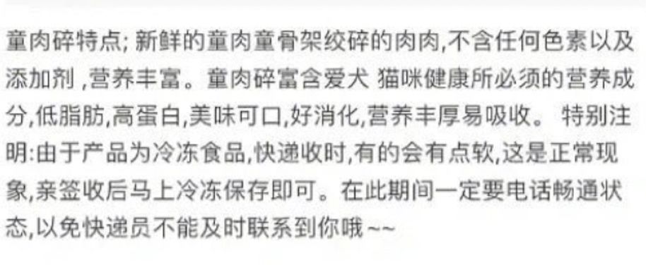 商品詳情中還指出女童肉富含愛犬、貓咪健康所需的營養成分,「美味可口,好消化,營養豐厚易吸收」,更將商品種類分類在「高級貓糧、狗糧,新鮮現加工新鮮童肉泥」中,列出成分為「女肉童下體部位」,同時附上的商品照是一名臉部被打上馬賽克的女童,右小腿「消失」。店家甚至宣稱女童肉體可生鮮批發,歡迎酒店(飯店)、餐飲業長期合作,「全天有貨」。