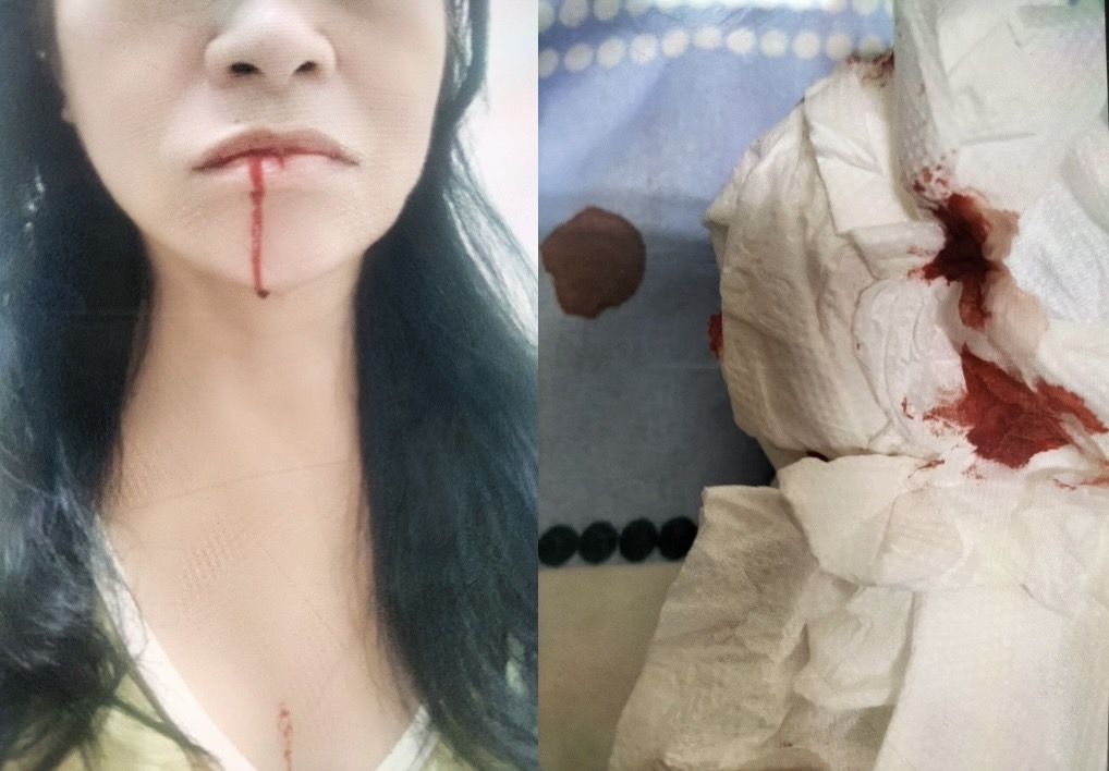 ▲女患者睡覺咳血,鮮血從嘴巴一路流到下巴,連胸口都有血跡。(圖/翻攝蘇一峰臉書)