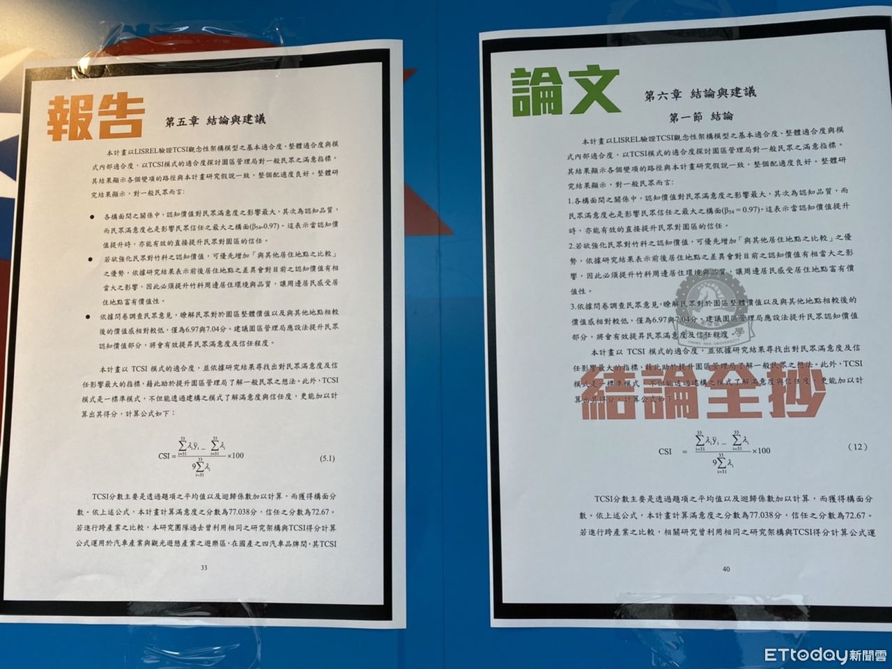 王鴻薇5日上午在台北市議會召開記者會,現場擺放一份林智堅在中華大學2008年7月發表的「以TCSI模式評估國內某科學園區之周邊居民滿意度」碩士論文,以及一份2007年12月26日科學工業管理局發標、2008年6月20日結案的「以TCSI模式評估新竹科學園區之民眾滿意度」(採購標案E961209)結案報告。