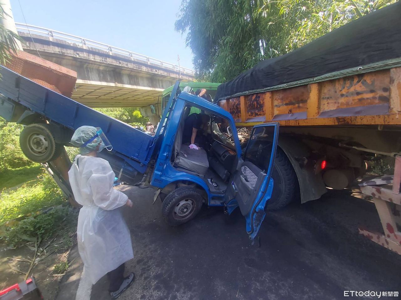 ▲小貨車和聯結砂石車在農路發生車禍駕駛受困,消防人員利用器材破壞車體才將受困駕駛救出。(圖/記者蔡文淵翻攝)