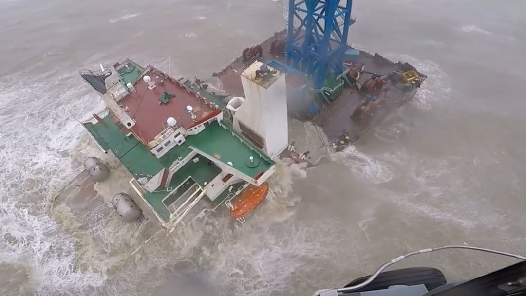 ▼福景001工程船斷成兩截,即將沉入大海。(圖/路透社)