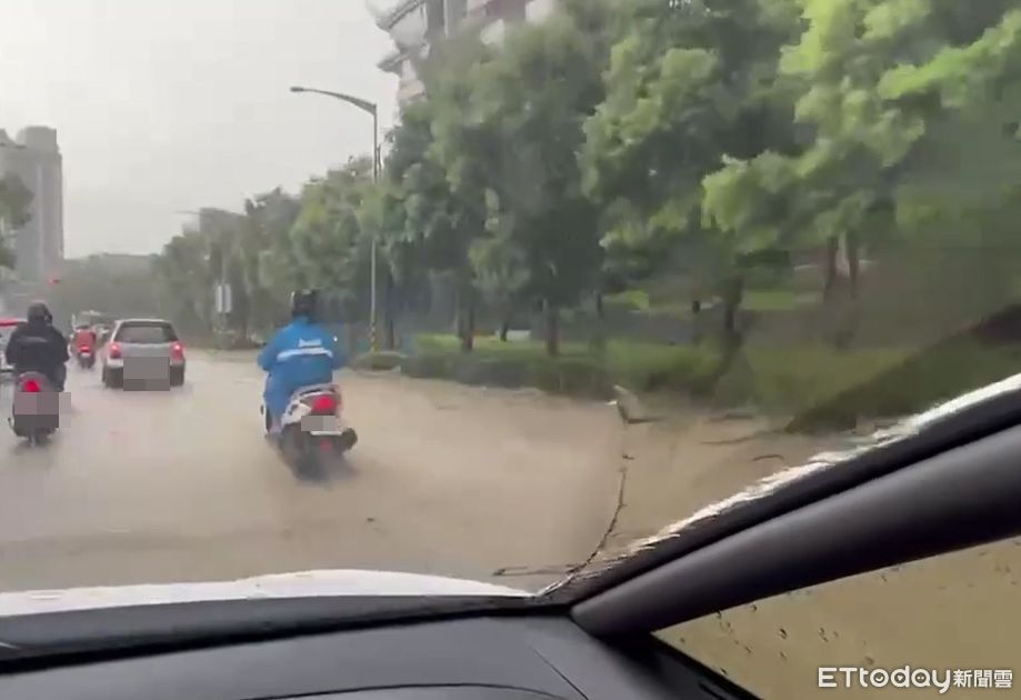 從短短37秒畫面可見,慢車道的汽機車都被迫在水中前進,水的高度約3分之1個輪胎。另外,氣象局表示,因西南風影響及午後對流發展旺盛,易有短延時強降雨,大台北、宜蘭、南部地區及中部以北山區,今天都有局部大雨發生的機率,請注意雷擊及強陣風。