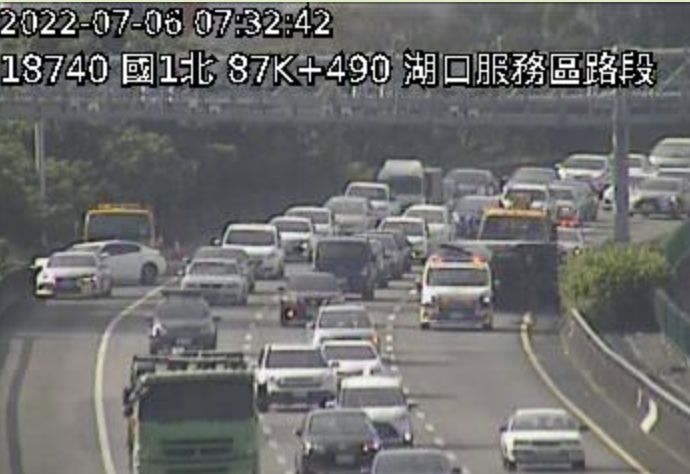 高公局表示,今天7時16分,國道1號北向88K、湖口服務區路段,發生2輛轎車和一輛大貨車追撞翻覆,佔用內、外線事故,事故處理中,後方回堵5公里,請用路人小心駕駛。目前該路段時速「紫爆」,僅剩14公里。