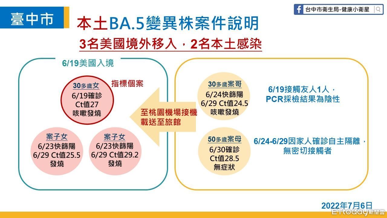 Omicron亞型變異株BA.5入侵台中!台中市衛生局今天下午在疫情記者會公布,台中有5名BA.5確定病例,全是一家人。據悉,是一名30多歲女性帶2名孩子自美國返台先後確診,當時前往接送的母親、哥哥也都確診,基因定序後確定都是染感亞型變異株BA.5。