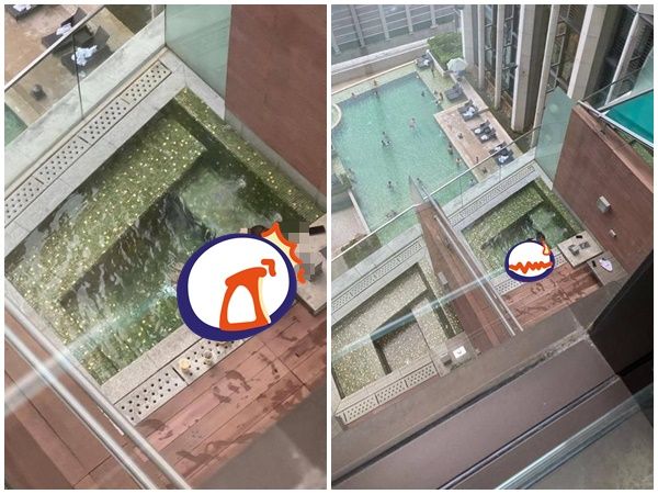 此外,男女忘情親密時,樓下最大的泳池中也有多人在戲水,而整個畫面都被上方的房客給拍下並PO網。
