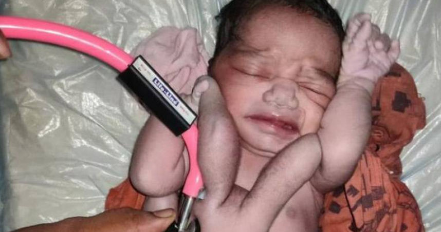 據《每日星報》報導,這起事件發生在北方邦的哈爾多伊(Hardoi),當地一處叫做沙哈巴德(Shahabad)村落,有一名叫做卡琳娜(Kareena)的婦人在2日時分娩,之後生出一擁有4手4腳的嬰兒,額外的4肢附著在胃上。