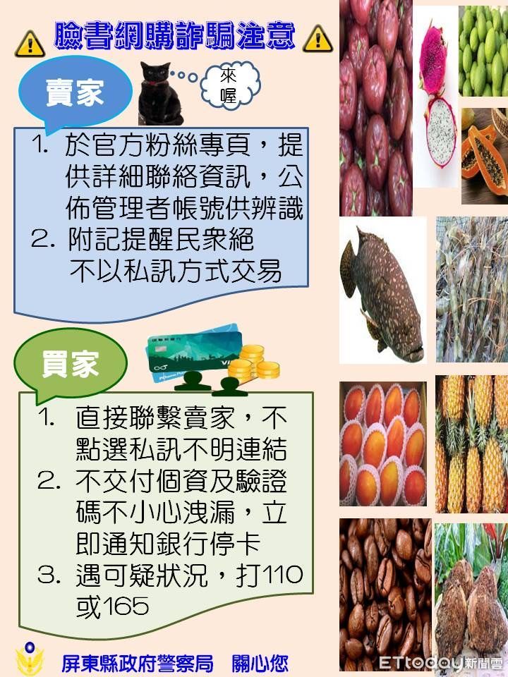 東港警方表示,由於當前資通訊匯流及金融科技蓬勃發展加上疫情影響,國人從以往至傳統市場、大賣場等場所販售或購買農漁產品的消費習慣,漸進至於Facebook等社群平台內成立相關團購群組或粉絲團,透過網路從事買賣交易,許多不肖歹徒亦趁機於網路社群或粉絲團截取優良商家相片,轉貼到架設同類型消售平台再刊登一頁廣告魚目混珠佯販賣來路不明劣質商品等各類詐騙,造成優良商家商譽受損及購買民眾財產損失。