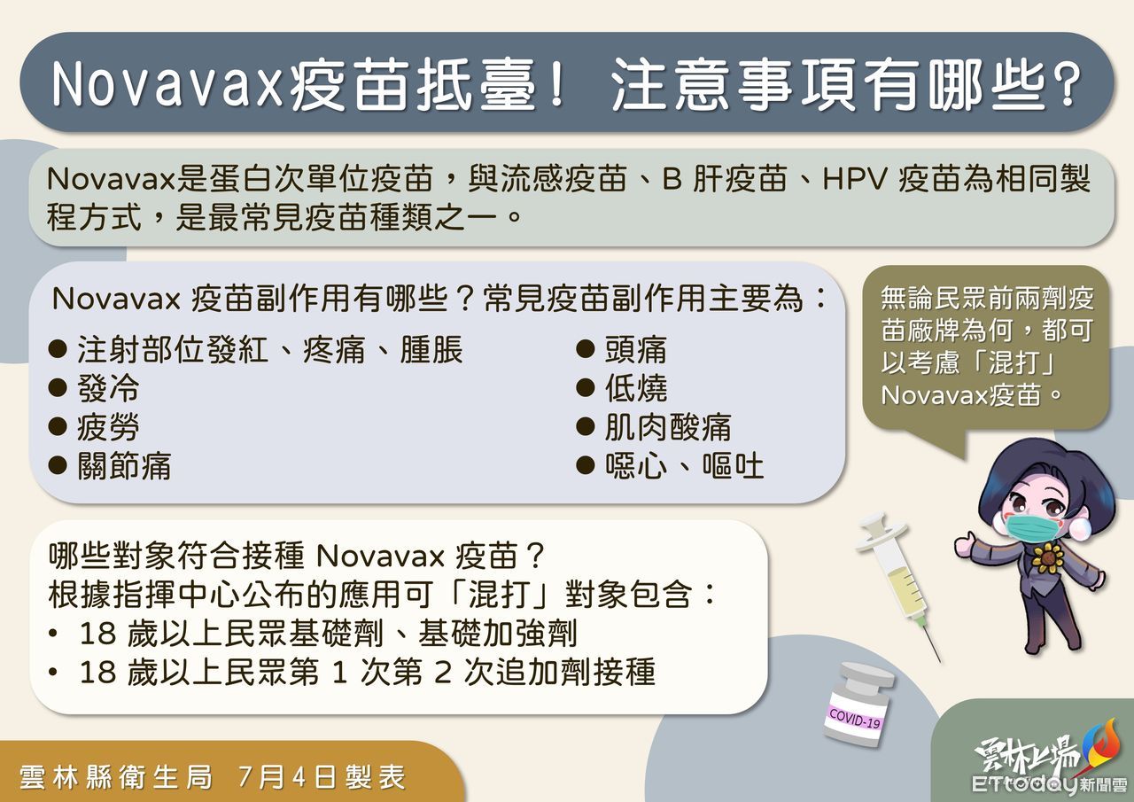 民眾目前最關注的Novavax疫苗可進行預防接種時程,雲林縣衛生局說明,Novavax疫苗已於今日分配到雲林縣內43家合約院所,於明(9)日配合診所門診時間,民眾可以前往預約、開始施打,相關疫苗接種服務可上雲林縣衛生局「疫苗地圖」網站查詢。