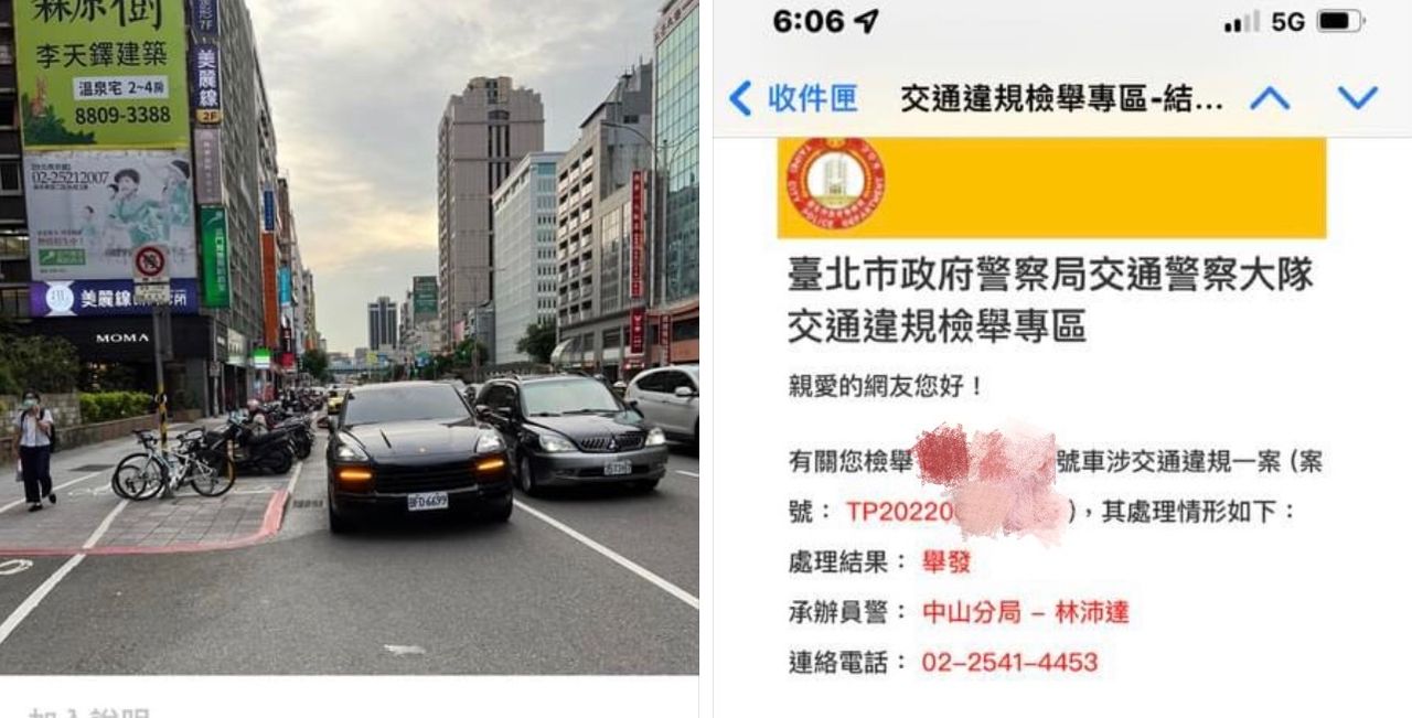 最後網友在臉書上貼出保時捷休旅車違規停車照片,另外還附上「台北市政府警察局交通警察大隊交通違規檢舉」的頁面,內容檢視已經檢舉成功,顯示警方已經受理。