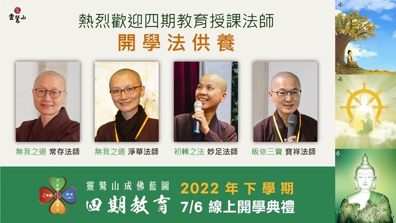 四期教育,開學有你;成佛之道,一起同行!靈鷲山四期教育全球線上開學典禮7月6日熱鬧登場,近300位學員齊聚雲端,歡喜以法相會,感恩佛陀的法教、開山住持心道法師傳承諸佛法,利益一切眾的願力。