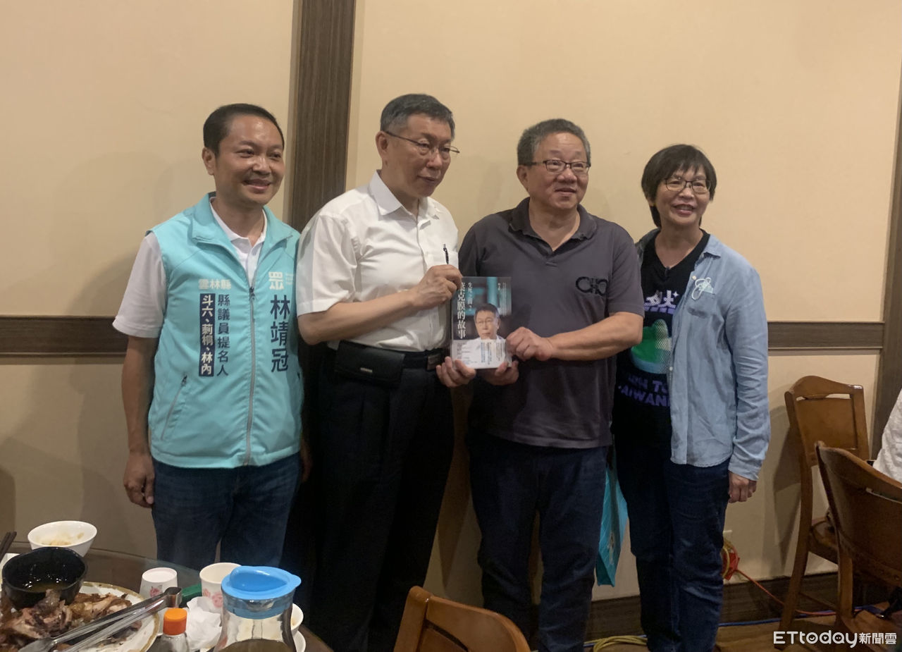 今日18時許柯文哲與立委蔡壁如結束一日山海行程,返回雲林第一選區候選人林靖冠位於斗六市的服務處,黨主席柯文哲贈送親手所寫政治金句「政治不難,找回良心而已」筆墨字框掛於服務處,期許其能抱持初衷為民服務,眾人參觀服務處寒暄後隨即前往餐廳用餐。