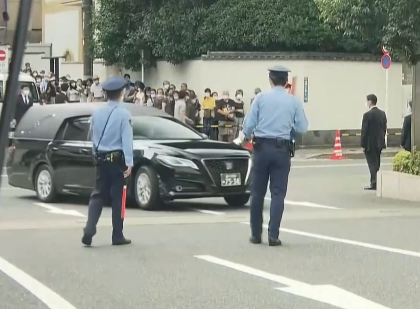 日本前首相安倍晉三遇刺身亡,稍早於東京增上寺舉辦葬禮,同時只開放至親友人參加。載著安倍遺體的靈車於下午陸續行經自民黨黨部、首相官邸、國會議事堂,最後抵達品川的殯儀館。據悉,經過火化儀式後,安倍的骨灰將會安葬於山口縣老家的安倍家墓,與父親安倍晉太郎一同長眠。