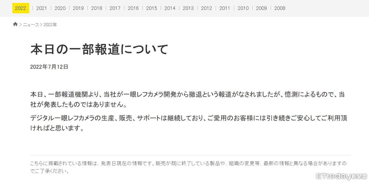官網聲明:「今日有媒體報導,我們已經退出單反相機的開發,但這是猜測,我們並沒有宣布。我們繼續生產、銷售和支持單反相機,希望我們的客戶繼續安心的使用」。