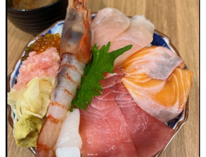 從照片中可見,鮭魚親子丼上方滿滿切塊的鮭魚和鮭魚卵,正中間還有一顆生蛋。此外,生魚片丼飯上有數種生魚片、鮭魚卵、還有一隻很大的葡萄蝦,旁邊還放上讓客人解膩的薑片。