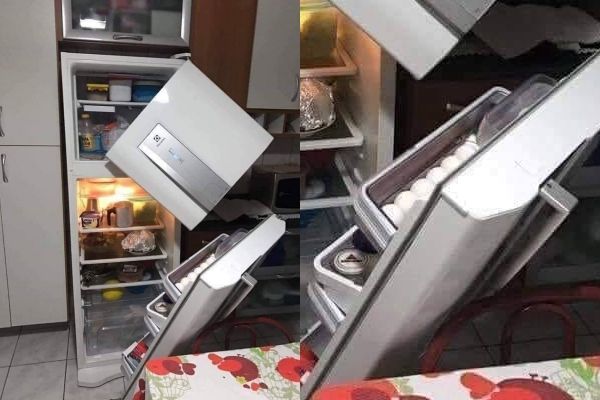 原PO在臉書「爆笑公社2」分享一張照片,並留下一句「各位團友早上好!靠北邊走,開個冰箱以為在上演變形金剛一樣!」而在照片中,只見一台冰箱上下2扇門都損毀了,下方的門幾乎整扇脫離,斜斜靠在椅背上,上方的門則只剩下1個角還和冰箱本體連在一起。