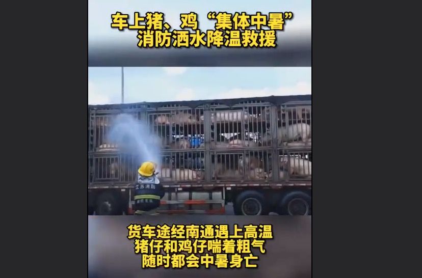 報導指出,近日有兩台貨車從內蒙古到浙江,車上共120多頭豬,途經常州差點被烤熟,急需降溫。原來,當天最高氣溫達到40.2度,貨車車廂成了「烤箱」,豬的表面皮膚都紅了,差點成為烤乳豬。