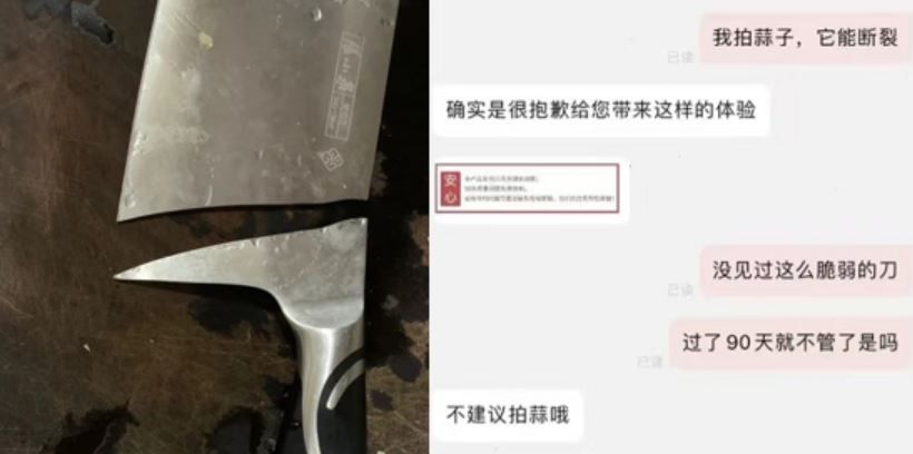 廣州王女士先前買了一把大陸老字號刀具店「張小泉」的菜刀,不料一日拍蒜頭時,菜刀竟然從刀面直接斷成兩半。女子事後向客服投訴,不料對方竟告訴她,菜刀不能用來拍蒜頭,令她相當錯愕,將對話過程PO上網路,引起眾多網友關注。