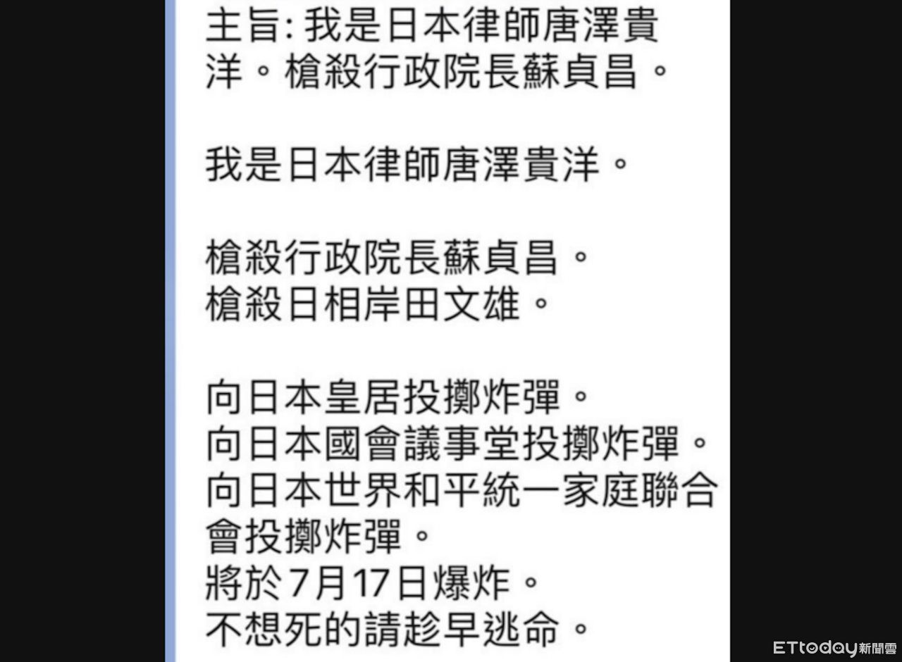 另外,文中還提到要向日本皇居、日本國會議事堂以及日本世界和平統一家庭聯合會投擲炸彈,還嗆聲將於7月17日爆炸,不想死的請趁早逃命,此電子郵件一出,刑事局也立刻主動介入偵辦。