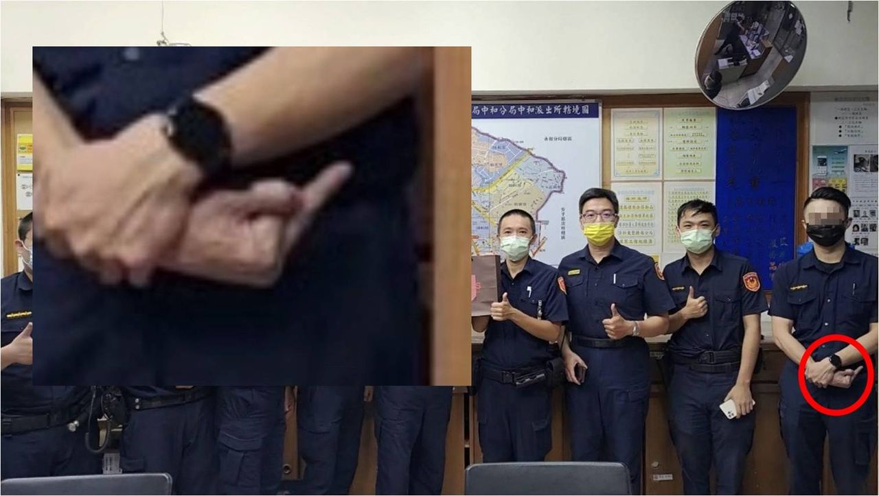 新北市中和區日前偵破一起槍砲案受市警局表揚,當天警政監前往頒發破案咖啡,還跟警員、分局長合影,看起來氣氛愉快。怎料照片PO上臉書後,有眼尖網友發現,照片中最右側的警員竟然「偷比中指」引起熱議。對此,粉專小編趕緊把照片更換,長官也把該員叫來問話,但該員一番解釋後,長官們更傻眼了。