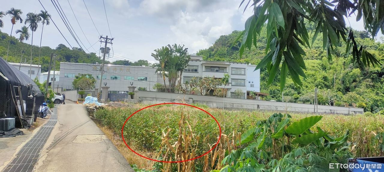 ▲當時一玫瑰花工寮老闆娘正在康建公司門前花田剪花(紅圈處),目睹李男騎機車衝入大門。