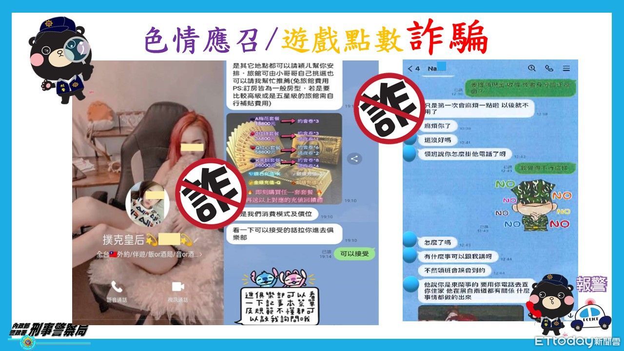 刑事局預防科秀出案例,北部一名22歲王姓資訊業男子,日前在網路社群T平台上看到標題「我和一群姊妹經營外約俱樂部」貼文,對方邀王男加一名網路正妹暱稱「撲克皇后影兒」為好友,可介紹王男進撲克俱樂部體驗。