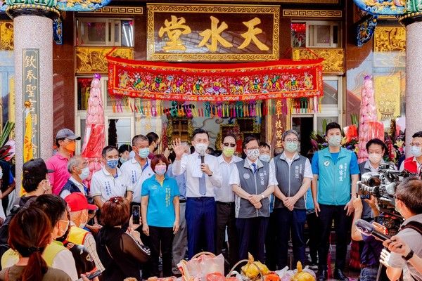 ▲鄭文燦陪同林智堅出席天水堂甲頭厝姜姓宗祠整修竣工登龕復位大典。(圖/林智堅競選服務處提供)