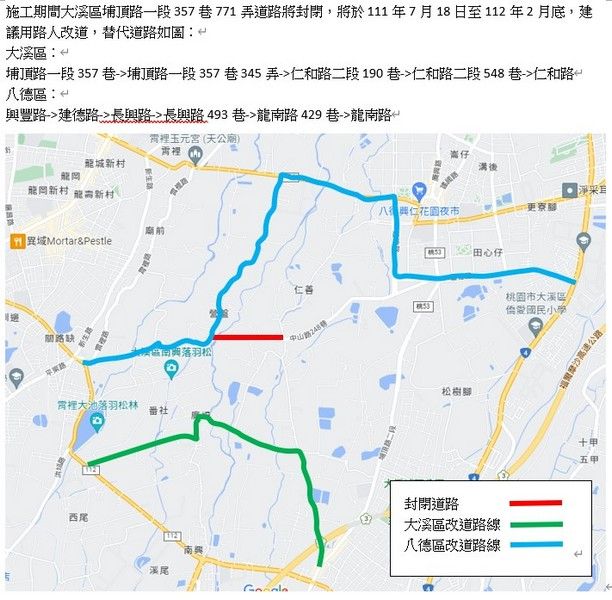 施工期間大溪區埔頂路一段357巷771弄道路將封閉,並請用路人配合改道若造成不便敬請見諒。