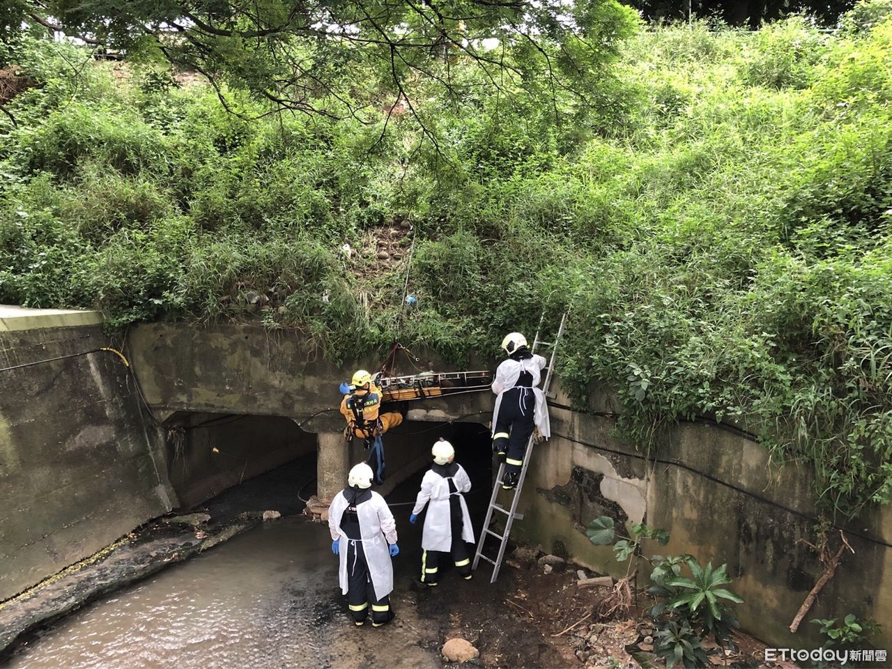 據了解,死者身綁繩子要到大排水溝下,疑似未綁牢掉落,頭部嚴重撞擊身亡,死因和身份待查。
