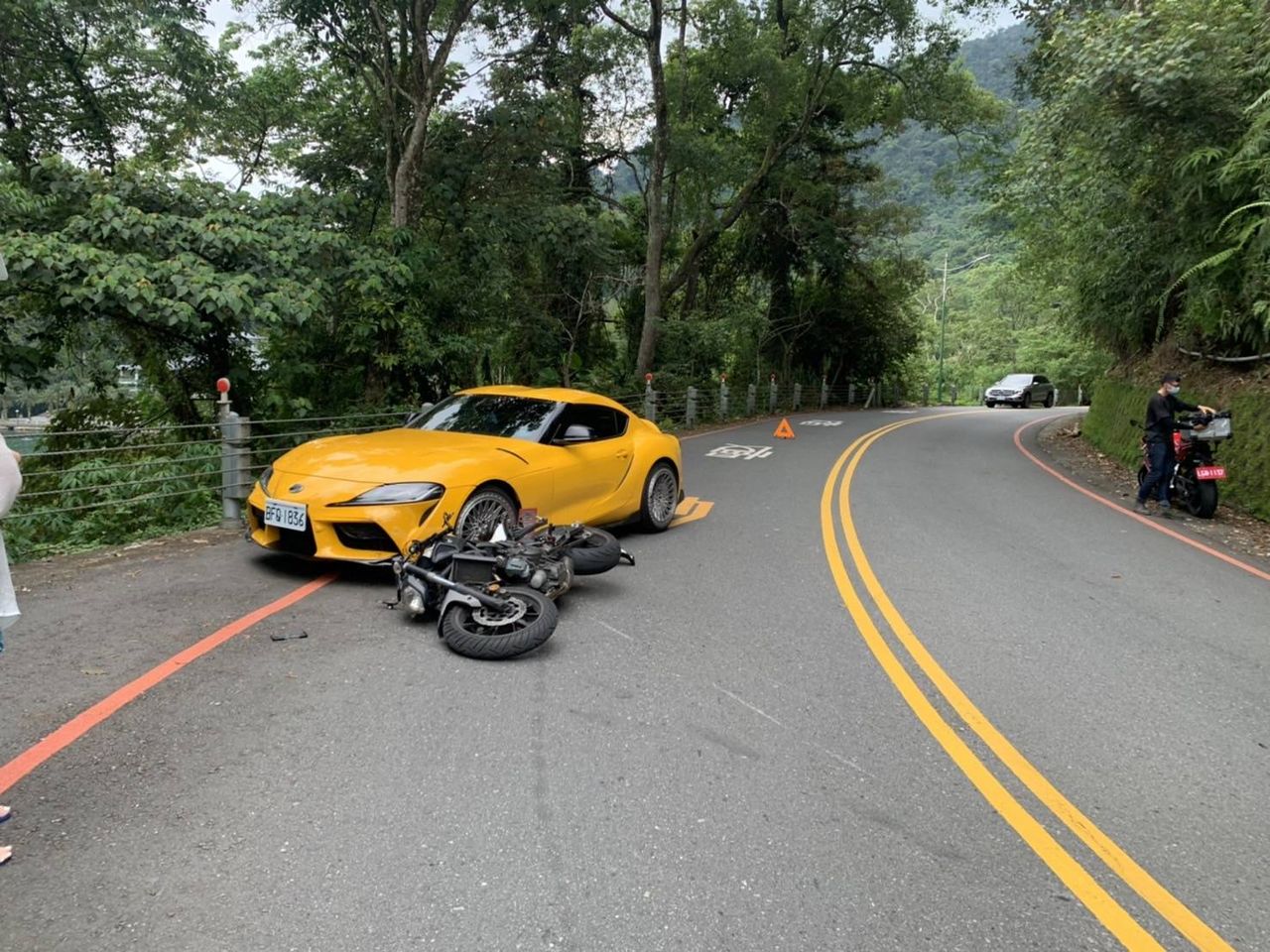 南投日月潭環潭公路19日發生一起交通事故,一輛新車要價逾200萬元的Toyota GR Supra跑車,行駛一處彎道時遭對向一台疑失控打滑的紅牌重機撞上,幸雙方駕駛均無大礙。車商表示,跑車恐傷到車頭板金烤漆,原廠修復約只要8、9000元。