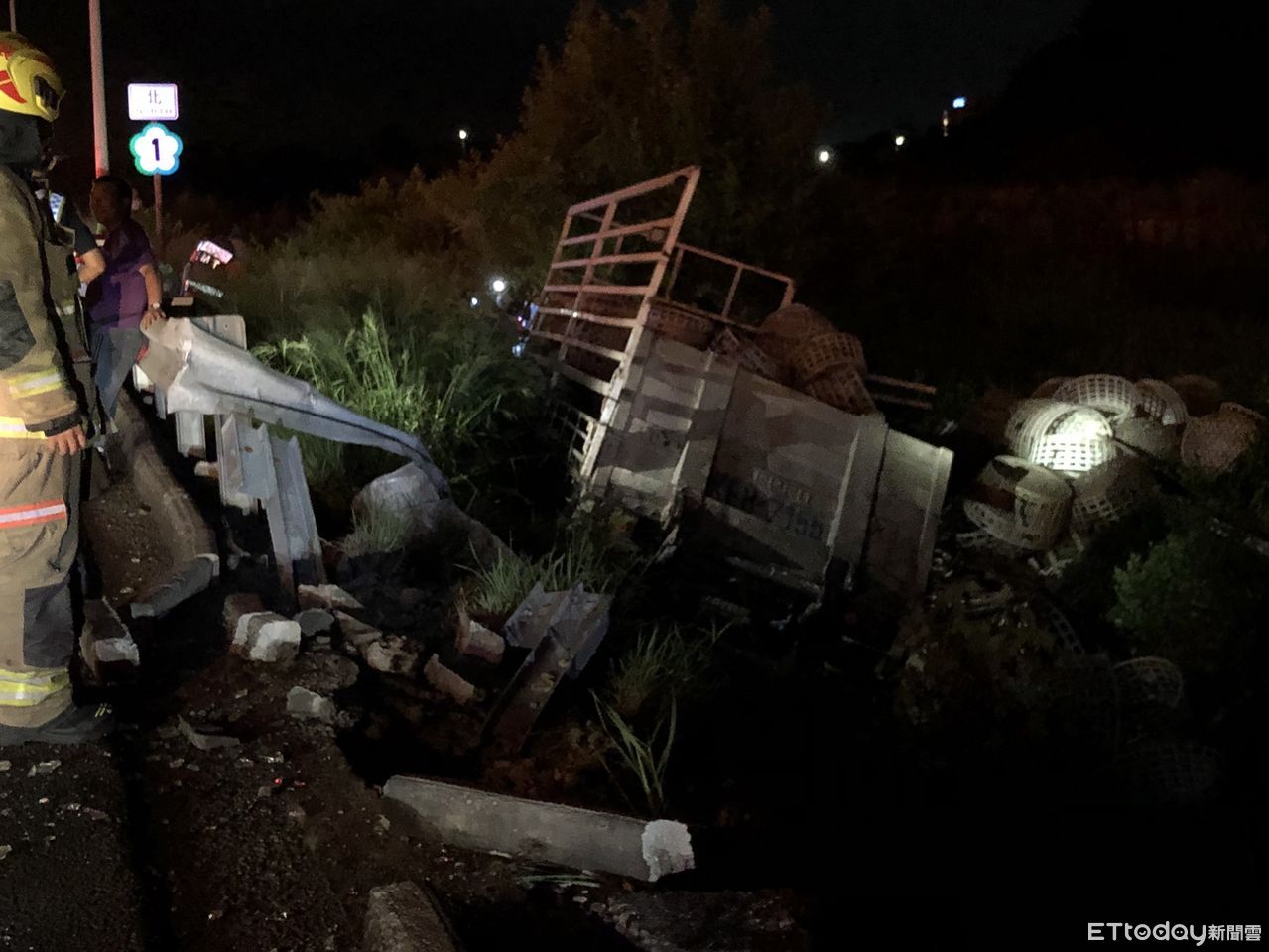 ▲國道1號北向314.8公里新市段,22日凌晨發生1起自大貨車右前車輪爆胎,造成車輛失控撞及外側護欄後衝停外側邊坡,消防人員搶救受傷者送醫。(圖/記者林悅翻攝,下同)