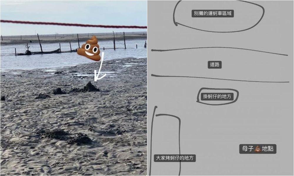 這一幕原本應該沒什麼,直到朋友傳達了一句,「據朋友說,媽媽還問兒子:『還有要大嗎』」,讓她瞬間驚呆,「……Ok,她兒子在拉屎+棒溜?」原PO忍不住畫出當時的區域示意圖,「旁邊就是蚵仔,還有一堆人在吃烤蚵仔,他在那邊拉屎棒溜,然後結束還埋高高,變成一個大沙堆……(警示別人不要挖……?)。」