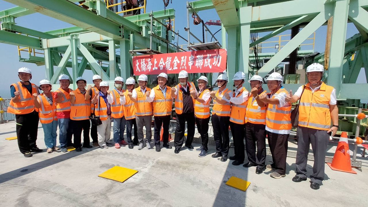立法院交通委員會立委陳雪生、洪孟楷、交通部長王國材、金門縣長楊鎮浯及秘書長陳祥麟共同於今(22)日見證金門大橋全橋合攏作業,並勉勵團隊把握最後施工進程,成就金門大橋深具歷史性意義的完工與通車。