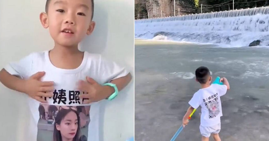 ▲男童穿著印有小姨照片的T恤外出遊玩。(圖/翻攝自微博)