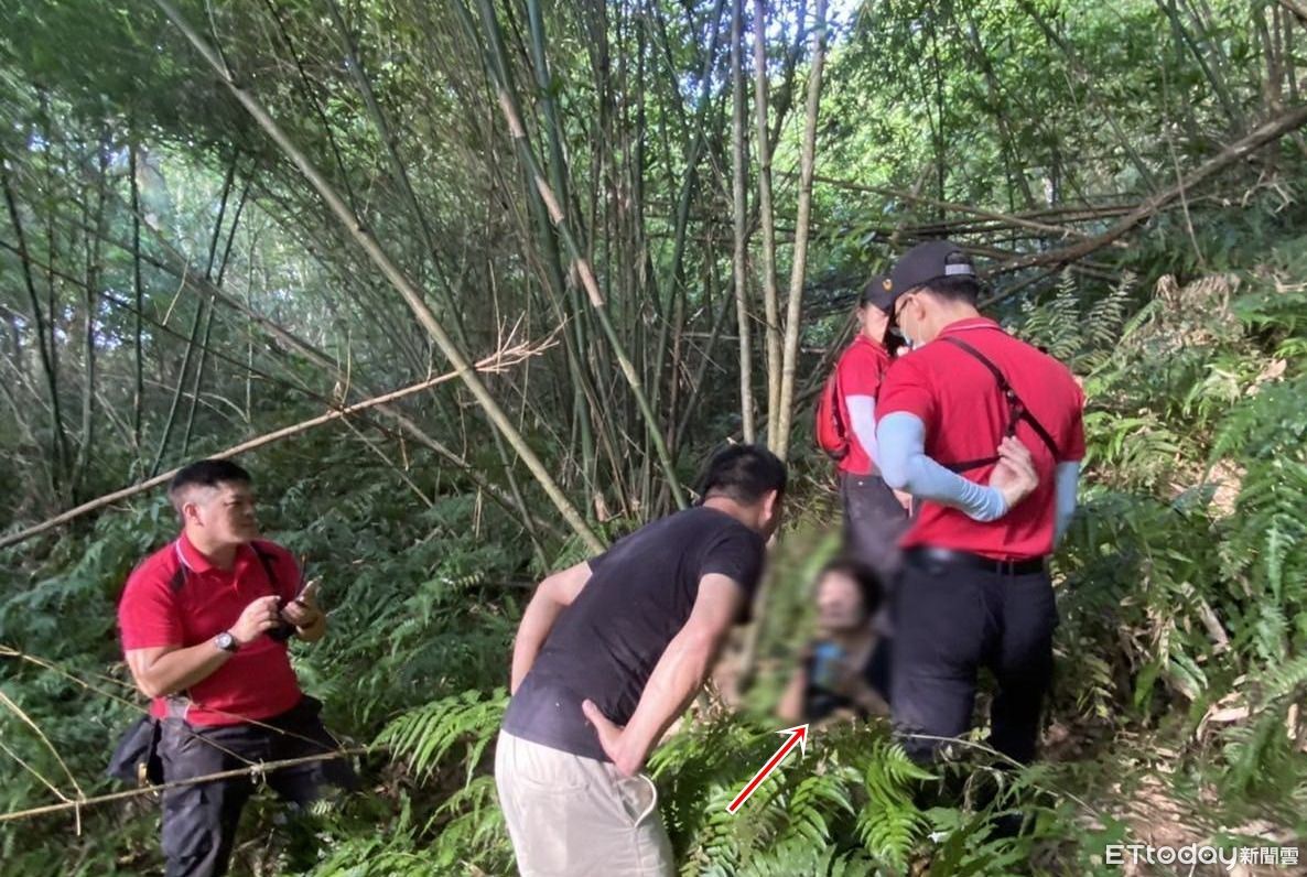 ▲王姓婦人(箭頭所指)在宜蘭員山鄉望龍埤風景區附近山區,不慎迷路失聯20小時終獲救。(圖/記者游芳男翻攝,下同)