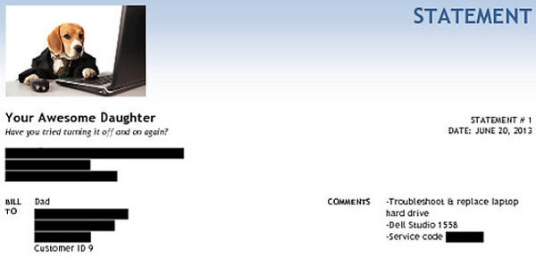 Clem_Honeybutter屬名為「超酷的女兒」,並將這份溫馨帳單寄給她的爸爸「客戶9號」。帳單上述明的服務內容包括備份檔案、研究錯誤訊息、購買新硬碟、更換新硬碟、恢復備份檔案等,而維修代價則是倒礦泉水、圍餐巾、吃披薩等她希望爸爸陪伴的事。