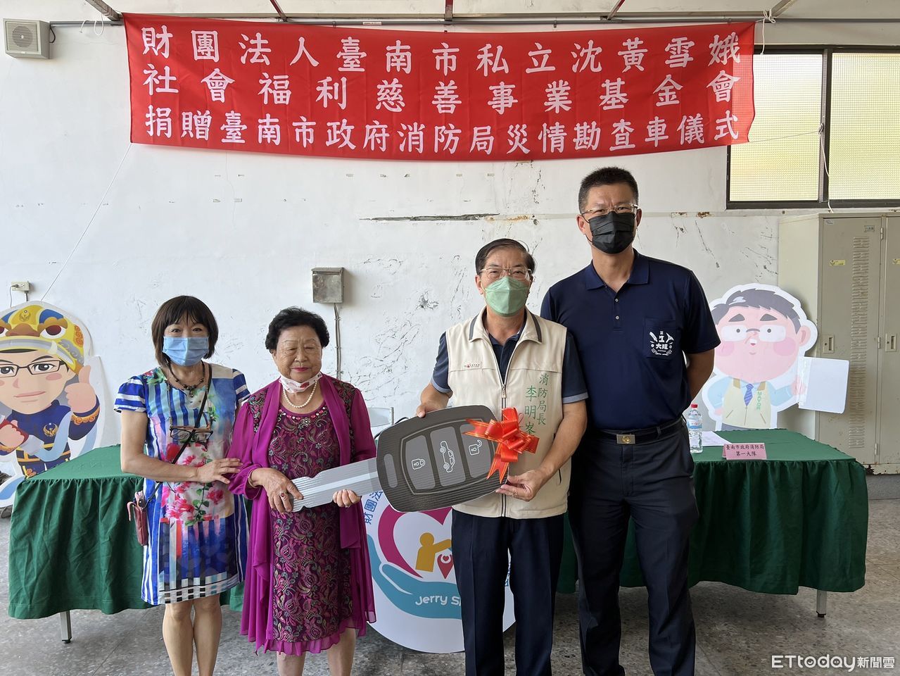 ▲沈黃雪娥社會福利慈善基金會捐贈消防局災情勘查車1輛,由沈黃雪娥女士親自出席,消防局局長李明峯代表受贈並頒發感謝獎牌。(圖/記者林悅翻攝,下同)