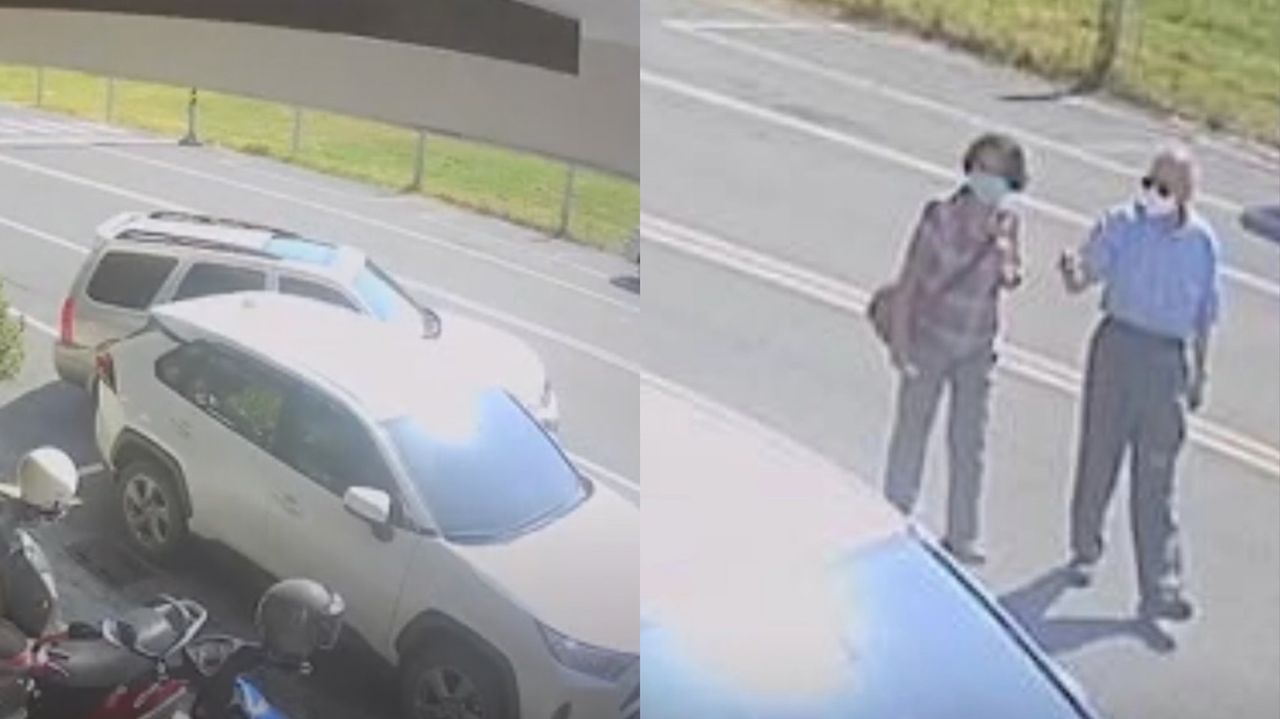 原PO下車查看發現車左後側確實被撞了一個洞,當下便先打電話報警,並詢問附近店家是否可協助調監視器,店家也願意幫忙,畫面中可見,該名三寶想停進原PO後方的停車格,但角度沒喬好,在擦撞原PO車輛後停滯幾秒,便開往對向的停車格,下車後瞄了原PO的車幾眼就離開。