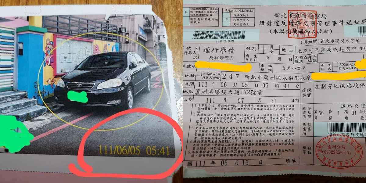 新北一名男網友在臉書《爆怨公社》貼出照片,原來他收到一張罰單,是他6月5日早上5點多違停紅線,被警察以「在劃有紅線路段停車」而開罰900元。