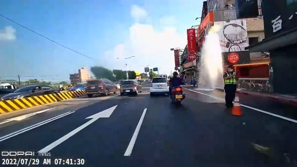 新北市淡水區民權路、馬偕醫院旁一處消防栓今(29日)上午7時許因故破裂,現場水柱衝到2層樓高,形成噴泉奇觀,機車騎士、行人為避免被淋濕紛紛閃避。目前警方獲報後已抵達現場,擺放交通錐提醒民眾注意,水公司也已前往現場處理;而消防栓為何會破裂,還有待進一步釐清。