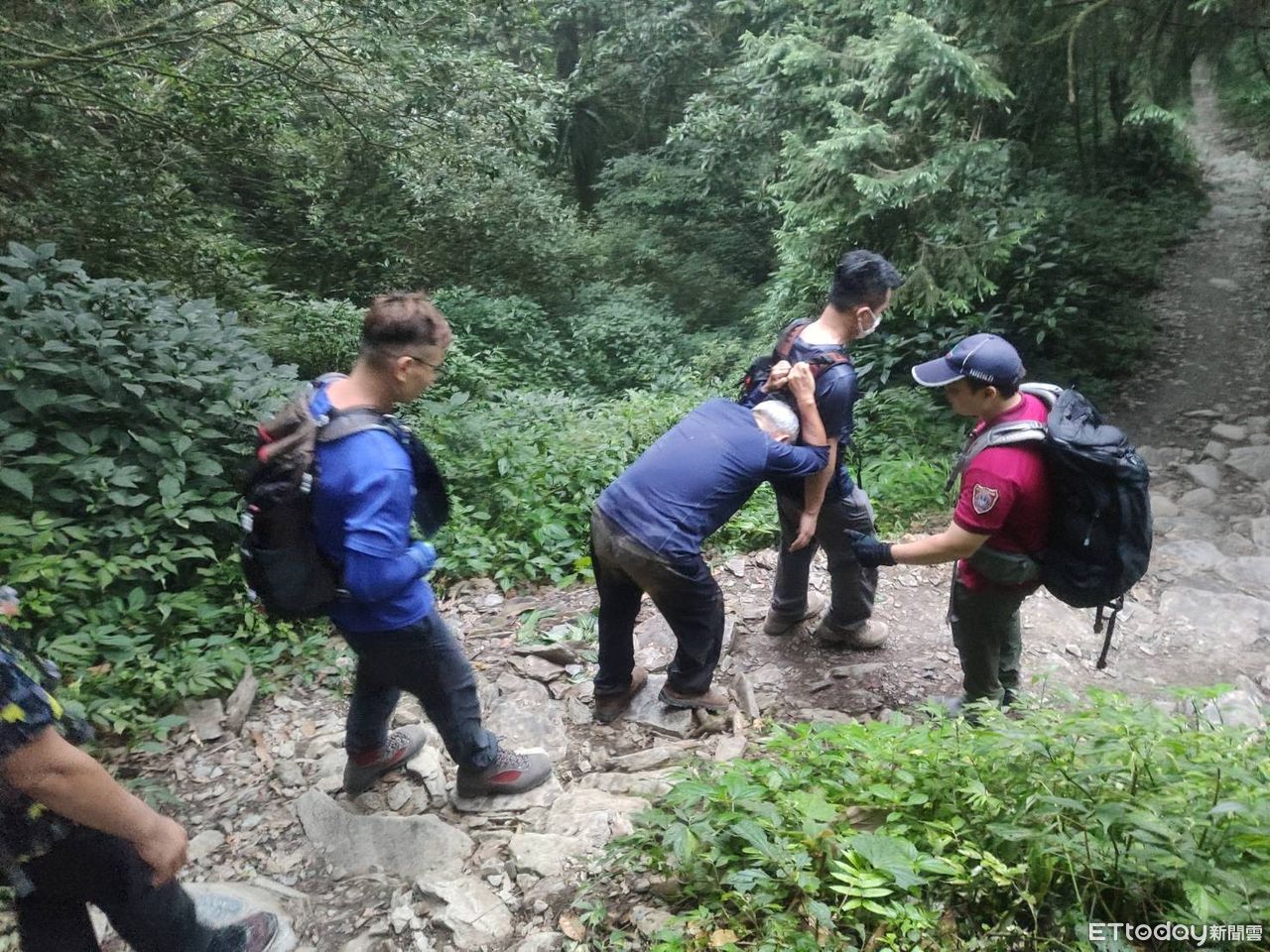 ▲登山團求救後,由屏東縣政府消防局人員以人力背拉方式將老大哥平安護送下山 。(圖/記者陳崑福翻攝,下同)