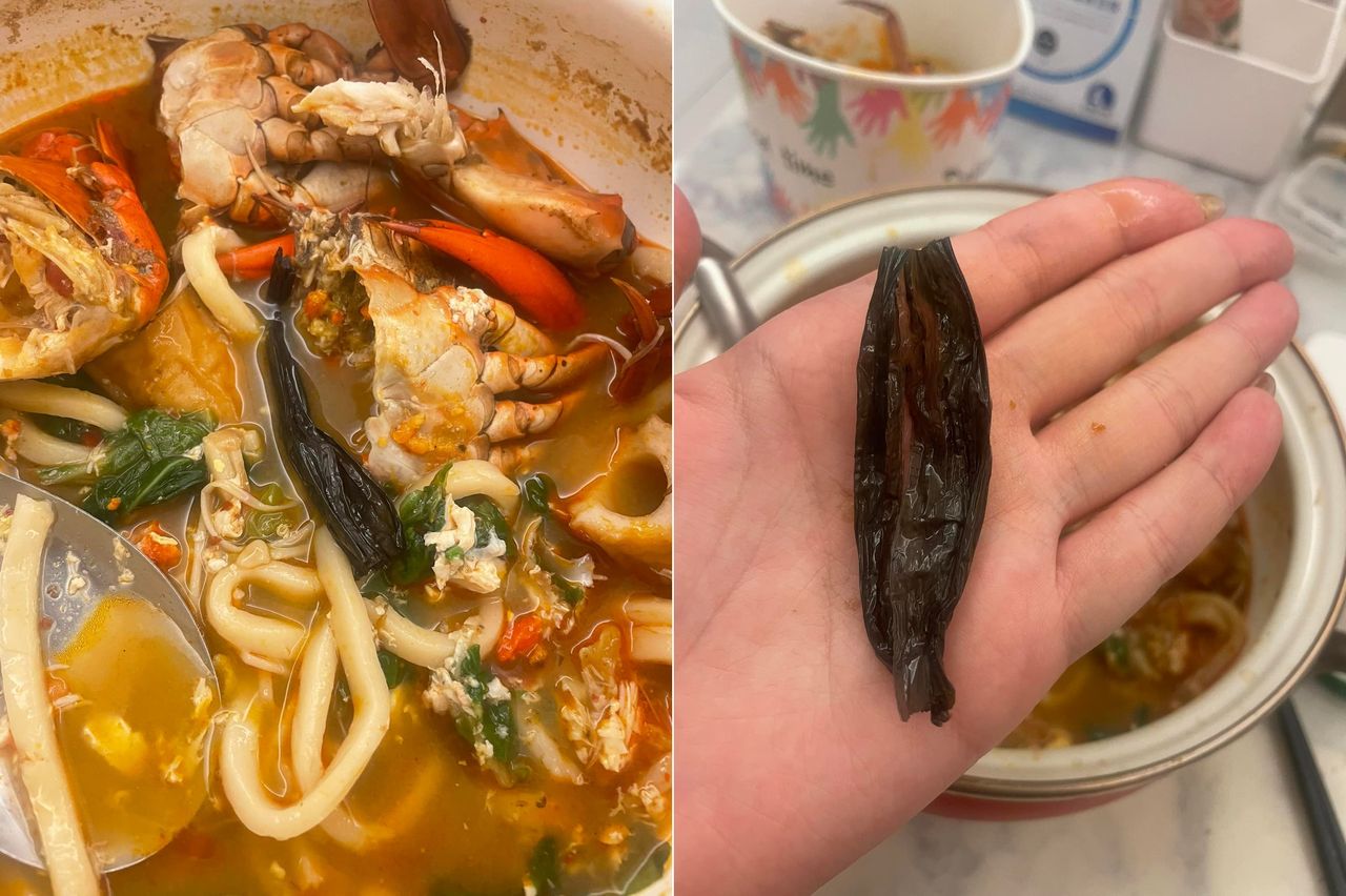 一名正妹網友在臉書社團「爆料公社」發文表示,她近日到網紅店X母X姆鍋燒麵店外帶2份紅蟳鍋燒麵「一碗煮、一碗不煮」,而店家先將螃蟹蒸熟後,連同湯料包一袋給她帶回家煮,結果她吃到一半才發現裡面有塑膠繩,不僅2碗都有,且都還化在湯裡,無法挑出。