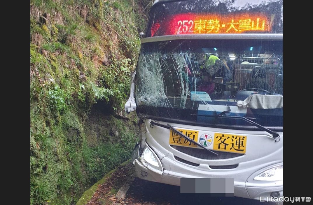 ▲一輛豐原客運今日下午在大雪山森林遊樂區內自撞山壁。(圖/民眾提供)