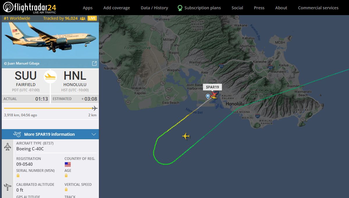 有網友發現,美國空軍波音C-40C於台灣時間30日從安德魯斯空軍基地(Joint Base Andrews)出發,目標飛往太平洋。消息曝光後,有9萬6000多名網友在線上觀看該機的航線,引起網友討論。據悉,該架班機目前暫時降落夏威夷,裴洛西是否在機上仍未知。
