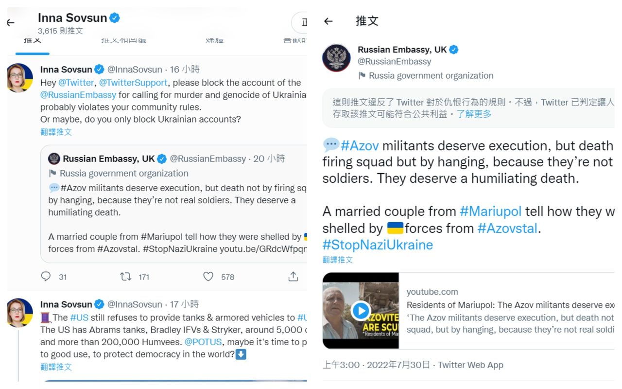 俄羅斯駐英國大使館在官方推特上表示,要讓亞速營份子「羞辱地死去」,遭到烏克蘭國會議員索夫桑(Inna Sovsun)在內等人檢舉是鼓吹「種族滅絕」。推特也屏蔽這一則發文,並且認證這一則貼文就是仇恨言論。