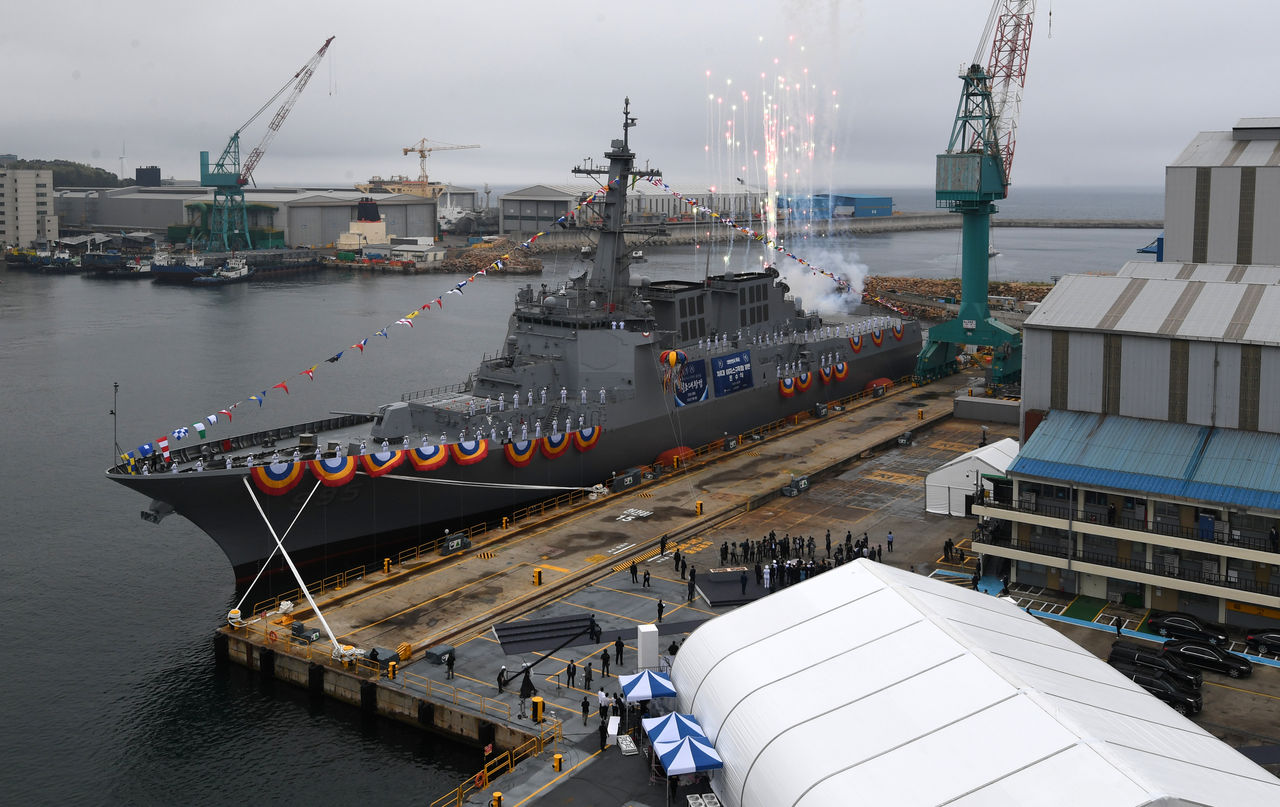 ▲南韓自主研發的神盾級驅逐艦「正祖大王艦」28日在蔚山現代重工業舉行下水儀式。(圖/達志影像/newscom)