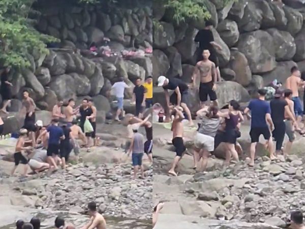 有網友在臉書社團「爆廢公社」PO出57秒影片表示,他31日攜家帶眷到山上避暑,沒想到竟遇到大亂鬥。影片顯示,兩派人馬至少16名男子在大豹溪邊互相攻擊,其中多人拿起石頭直接互丟,甚至從正面或後方猛敲頭部,讓幾名男子頓時暈眩,連腳步都站不穩。