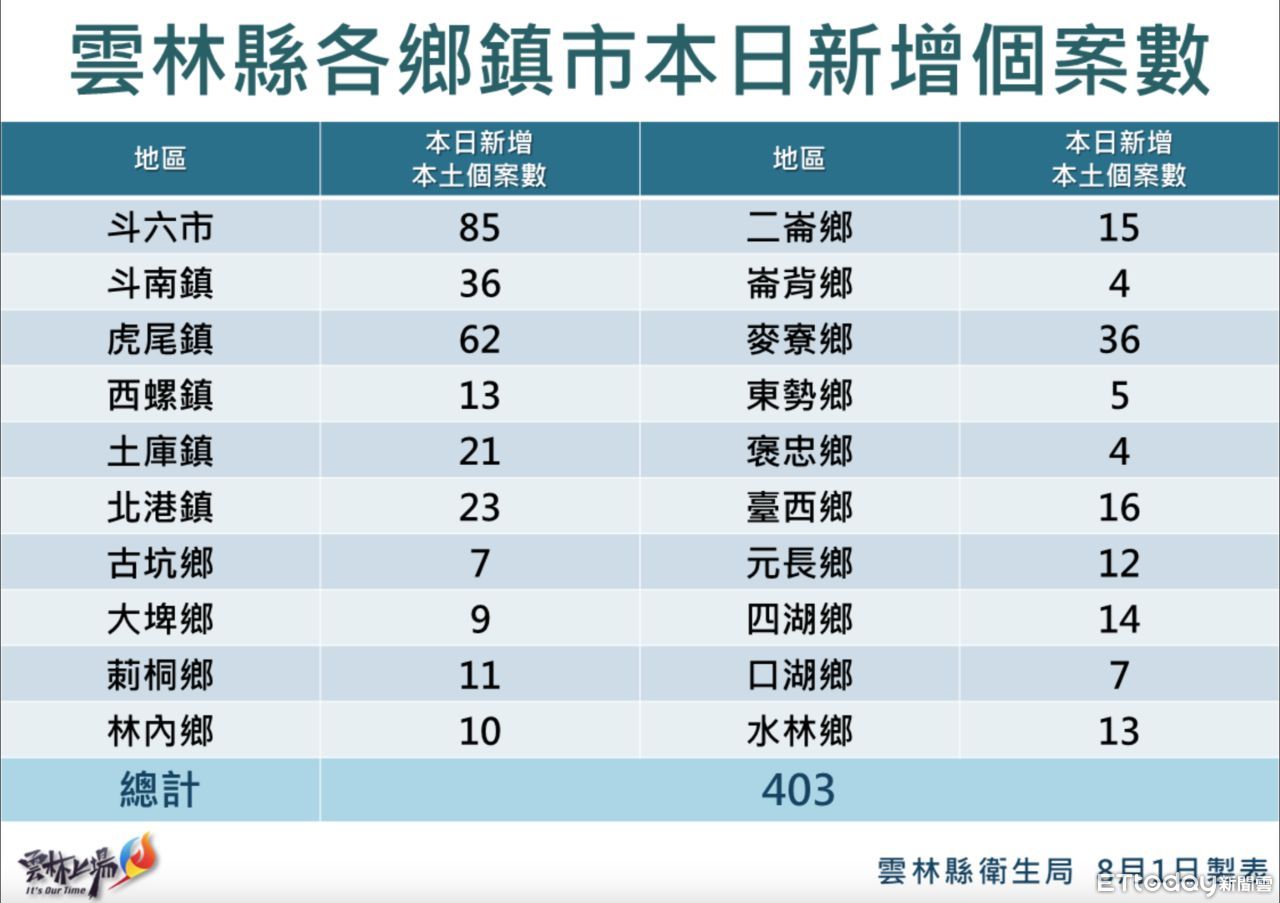 ▲雲林縣1日新增403例確診,分佈於20鄉鎮。(圖/記者蔡佩旻翻攝)