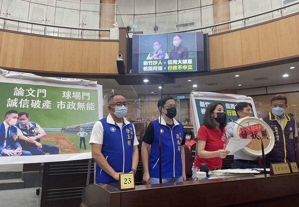 桃園市議會定期大會2日進行市長施政報告,甫於昨日接任民進黨桃園市長參選人林智堅競選總部主委的市長鄭文燦,受到國民黨市議員徐玉樹、梁為超、舒翠玲、黃敬平、詹江村輪番痛批,指稱鄭為身陷「論文門、球場門」事件,誠信破產和市政無能的林智堅背書,國民黨要捍衛社會公平正義,讓人民知道權力不是無所不能!
