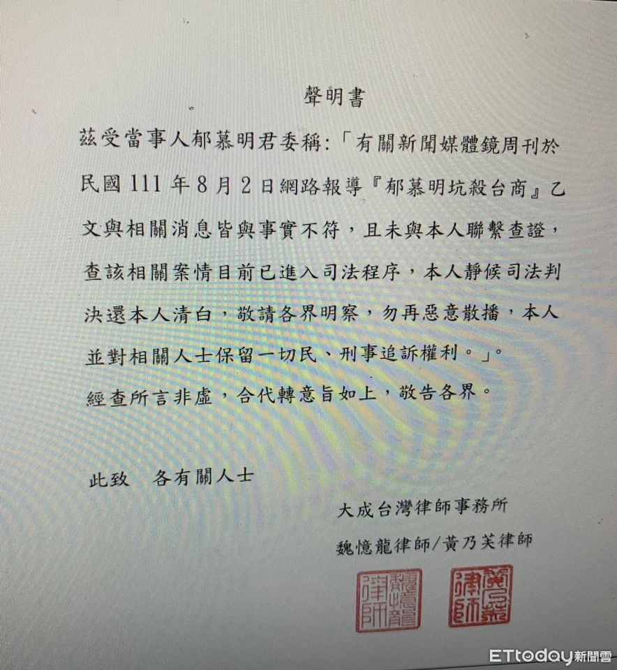 新黨主席郁慕明委任大成法律事務所魏憶龍律師和黃乃芙律師,今天發出聲明指出,鏡週刊在8月2日網路報導「郁慕明坑殺台商」報導內容與相關消息,皆與事實不符,且鏡週刊未與他本人聯繫查證,該案已進入司法程序,他將靜候司法判決,還他清白,請各界不要再惡意散播,他將保留民刑事追訴權利。